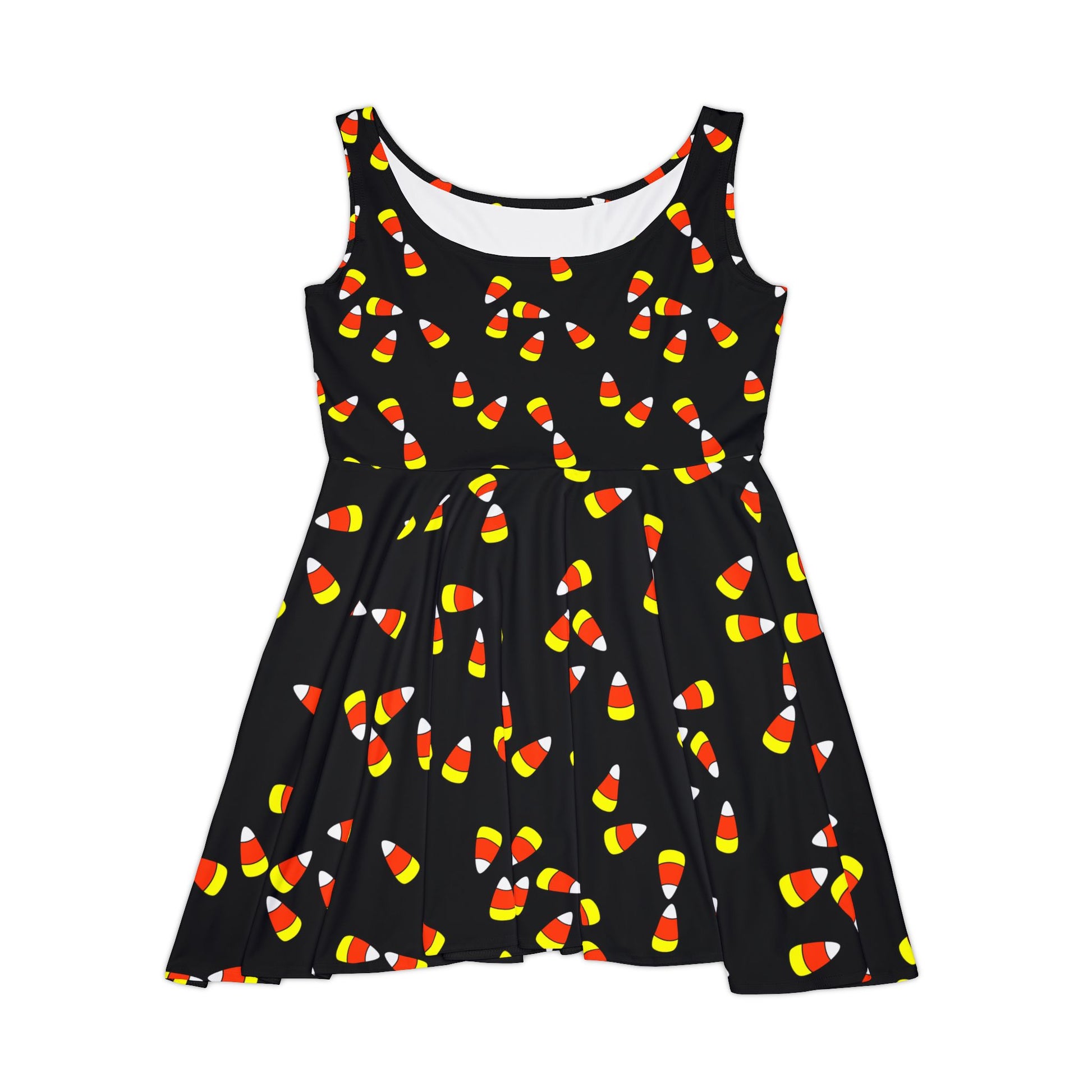 Step into fall and spooky season with this candy corn skater dress in a sweet twist on Halloween fashion! This black dress with a candy corn all over pattern is an understated way to celebrate and makes a great Halloween costume alternative. Great for teachers in the classroom! Fun to wear to the office with a cardigan or sweater. Makes a great casual dress for running errands and would be so cute with leggings, boots and a sweater to hand out candy on Halloween night. Perfect in October, but if you're an early Halloween gal like me, get started in September!